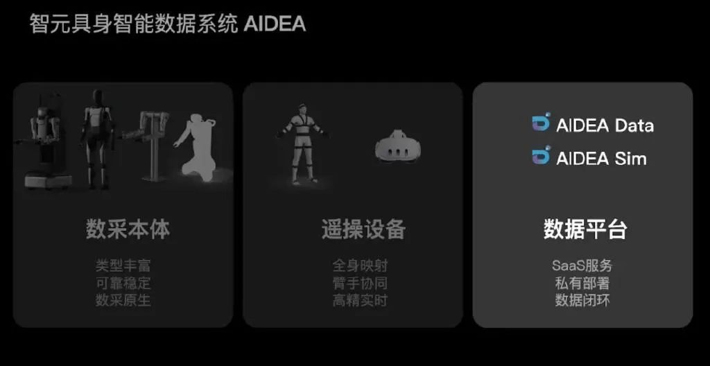 (2)AIDEA数据平台(智元具有智能数据系统):提供“采-训-推”一站式方案,已积累数百万条真机数据 数以千计的模拟数据。