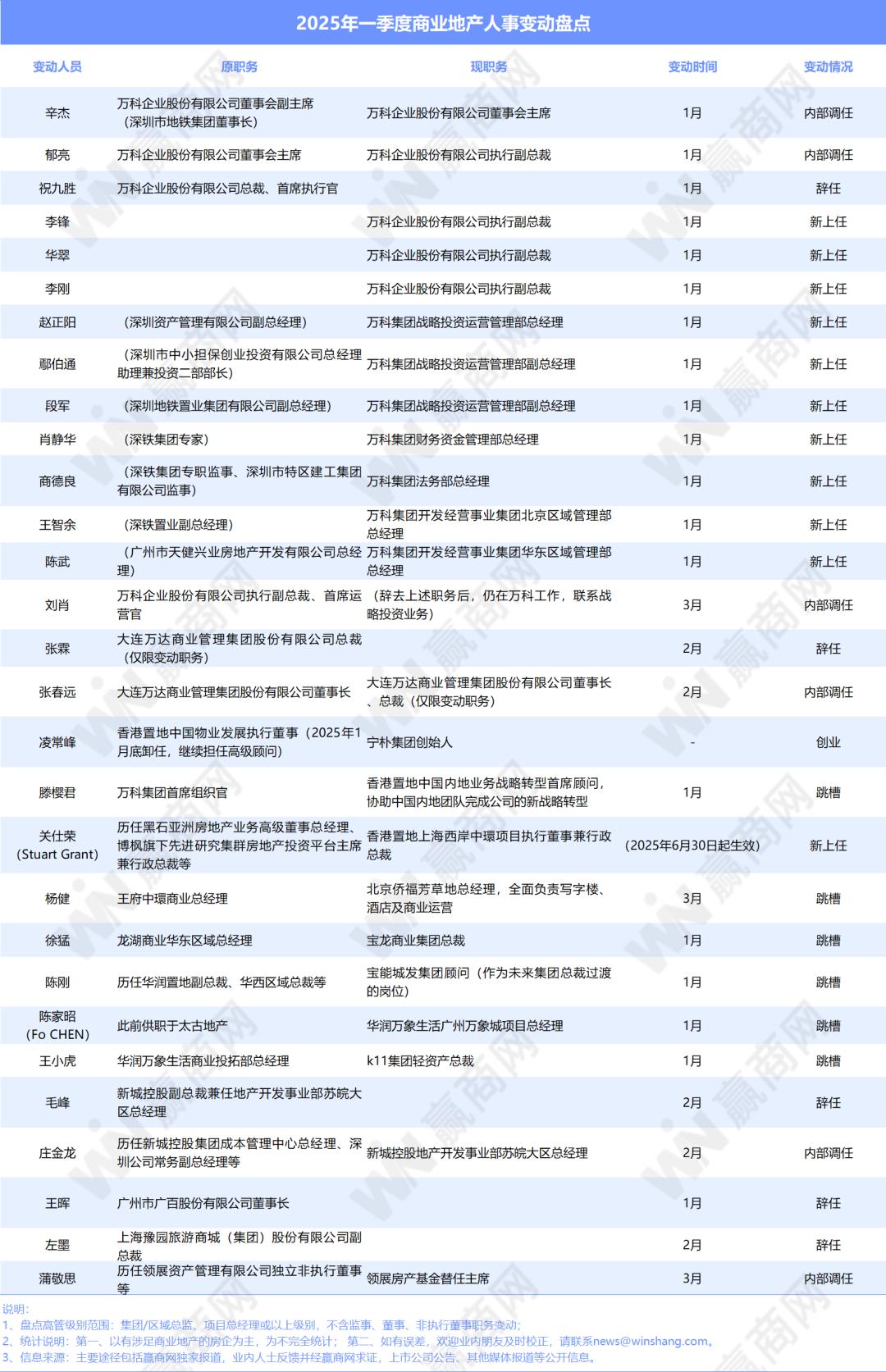 根据赢商网的不完全统计,2025年第一季度,商业房地产高管圈至少有近30起人事调整,涉及开发商/运营商超过10家。