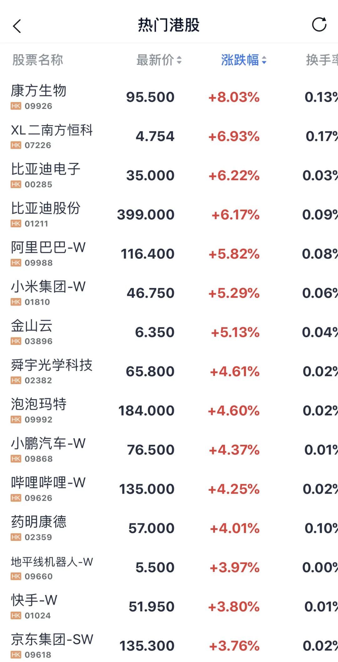 四月二十三日,香港恒生指数开盘上涨2.4%,恒生科技指数上涨3.5%。 热门港股方面,比亚迪电子、比亚迪股权上涨6%以上,阿里巴巴、小米集团上涨5%以上,泡泡玛特、小鹏汽车、哔哩哔哩等上涨4%以上。