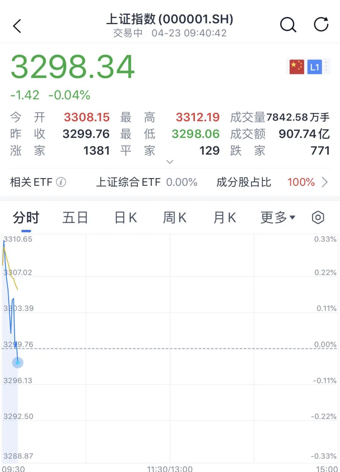 开盘后,三大指数短期暴涨后回落,上证综指翻绿。