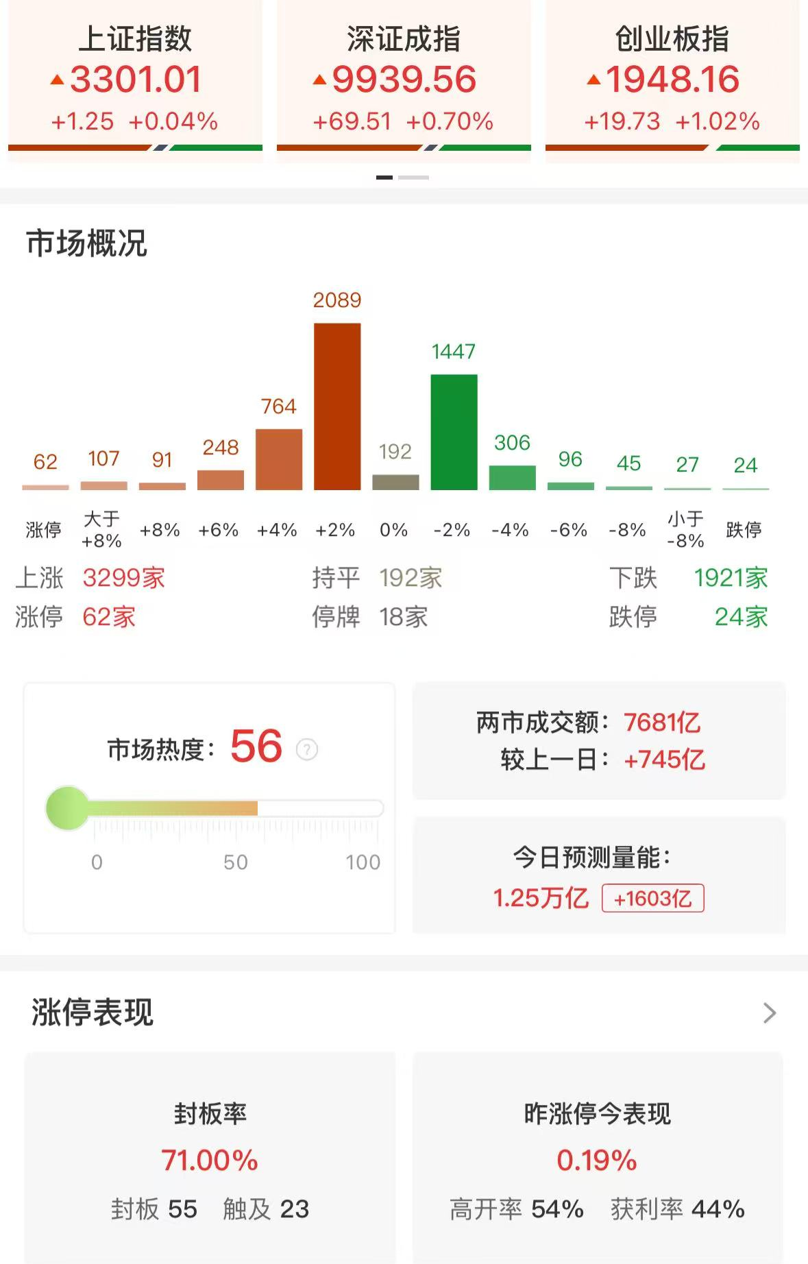 凤凰网财经讯 4月23日,市场开盘走高后,波动分化,创业板指引上涨。沪深股市半日成交额7681亿元,较上一个交易日成交量745亿元。盘面上的热点高低切换,个股涨跌少,整个市场上超过3200只个股上涨。