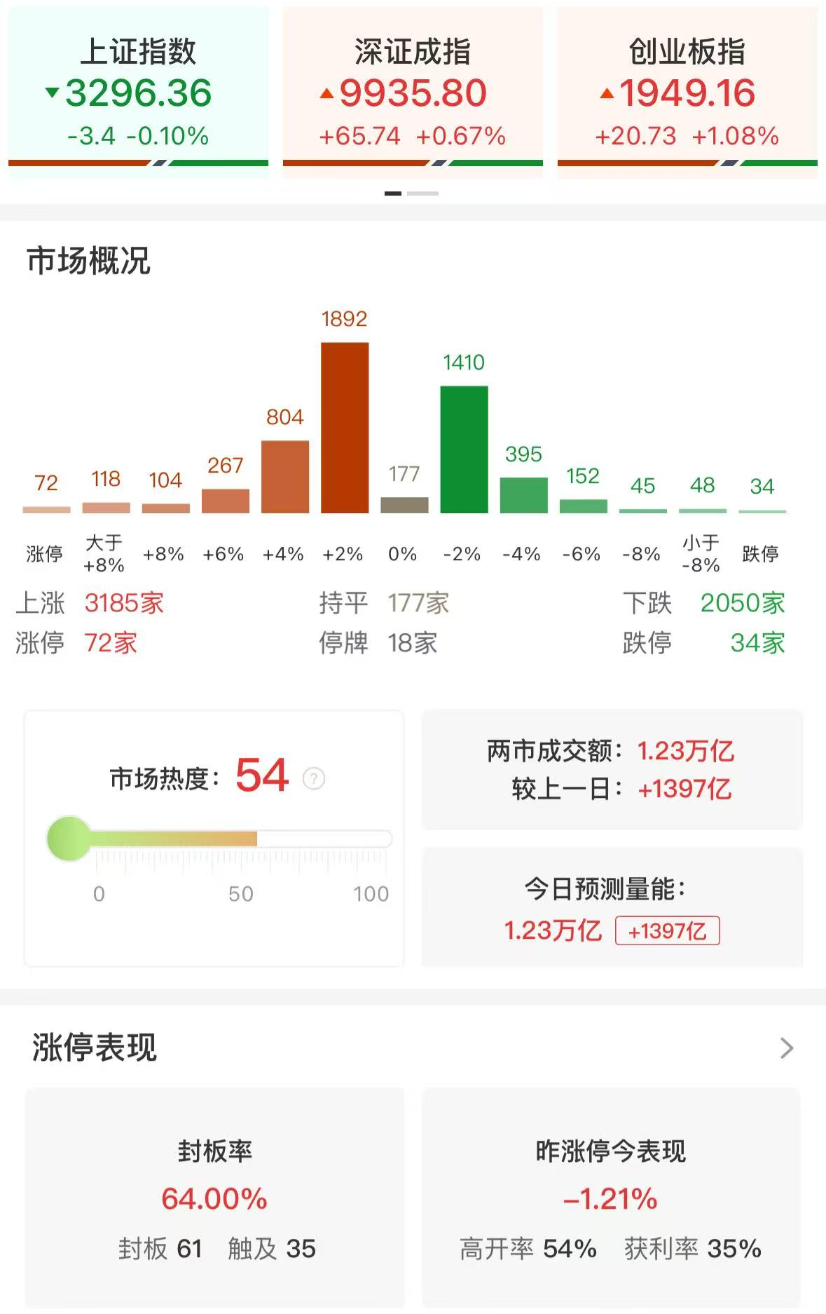 凤凰网财经讯 四月二十三日,市场全天高开后波动分化,三大指数涨跌不一。沪深股市全天成交1.23万亿元,较上一个交易日成交1397亿元。