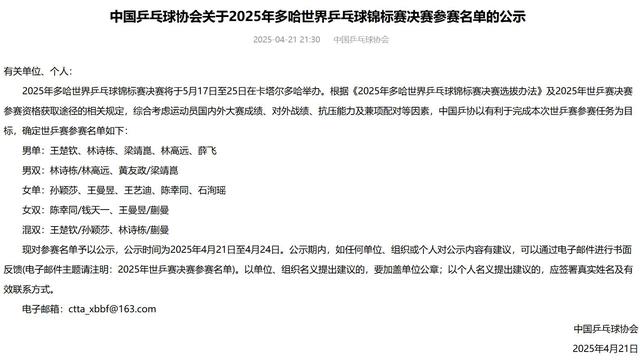 4 月 20 日晚,乒乓球世界杯男单和女单决赛结束。4 月 21 日本,中国乒协在官网公布了国乒出征多哈世乒赛的球员名单。