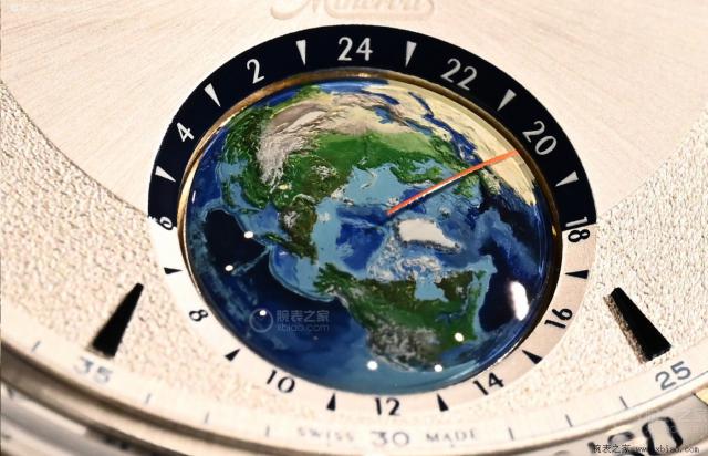 6 微缩北半球俯视图在点位上方,其中橙线代表零时区,模拟地球的工作状态。表层围绕 24 时刻度,以蓝白两色区分昼夜,时区变化情况一目了然。