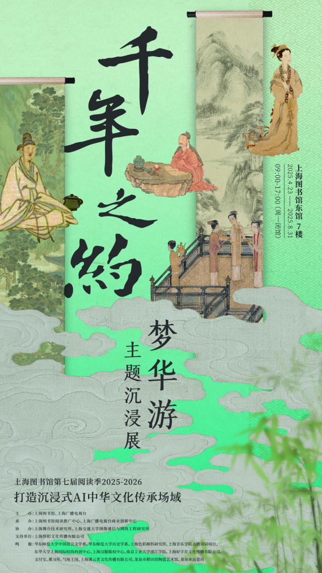 “活性”写在古书里,世界读书日当晚,沉浸式展览《千年之约》 · 梦华游在上海图书馆东馆七楼亮灯,带领读者进入跨越千年时空的文化漫游。展厅以反映宋朝城市生活的《东京梦华录》为原型,以苏轼、李清照、黄庭坚、王希孟的诗画为场景营造意境,结合诗歌、字画、插花、茶、香、茶百戏等元素,重构虚实交织的“宋韵四雅”,营造体验型中华文化传承领域。