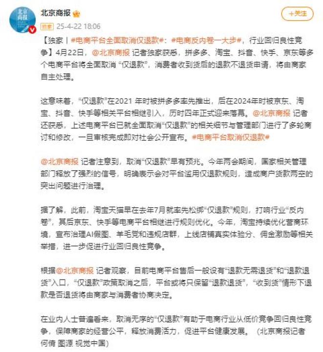 根据@北京商报 四月二十二日,记者独家获悉,拼多多、淘宝、抖音、快手、JD.COM等多个电商平台将全面取消。 “仅退款”,客户收到货后退款不予退款,将由商家自行处理。