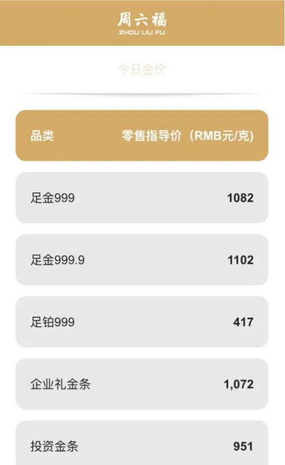 四月二十二日,星期六福足金999.9珠宝价格已经上涨到1102元/克。周大福、六福珠宝等多个品牌的足金珠宝价格,也接近1100元/克。
