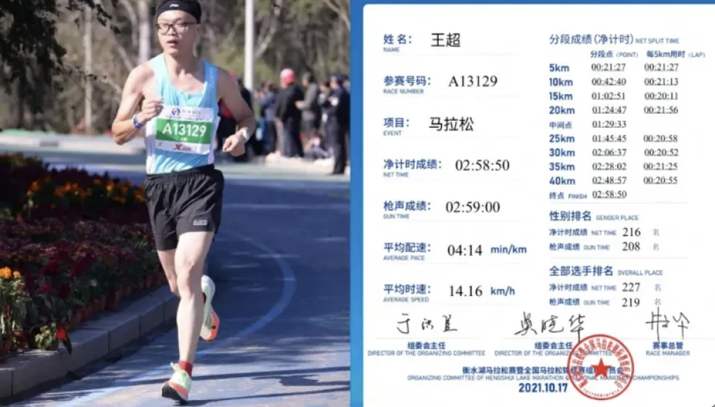 在2小时58分50秒内,王超自己的马拉松最佳成绩。