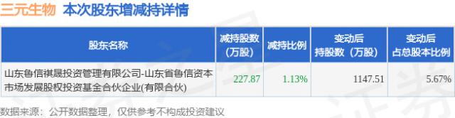 三元生物4月23日发布公告,股东减持227.87万股