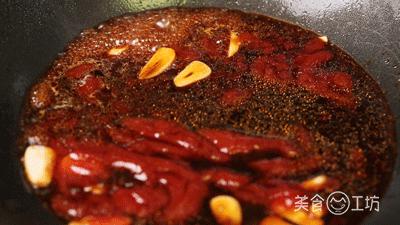 3、另外出锅,锅中加入适量的油、蒜、番茄酱、糖、酱油、醋,充分搅拌。
