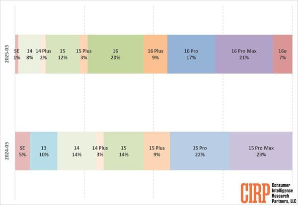 数据显示,iPhone 16e 在 2025 年度第一季度占据美国 iPhone 总销量的 表现明显优于7% 2022 每年发布并持续销售 2024 年第三代 iPhone SE。相比之下,去年同期的旧车型(即上市一年以上的车型) iPhone)在美国的销售比例是 今年将下降到32%。 反映出消费者选择趋势正在向更新、更现代的机型转移。
