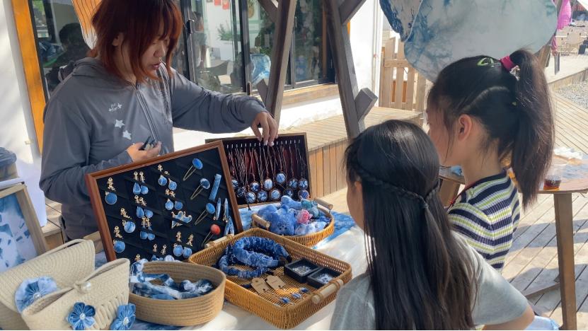 非遗扎染地区位于基地河畔,也很受欢迎。在工作人员的指导下,游客用棉线、夹子和图案卡精心绑扎面料,然后将其浸泡在天然染料中,如板蓝根。在解开绳索时,蓝白相间,独特的晕染图案跃然布上,孩子们纷纷将此作为春天踏青的独特纪念。他说:“通过互动体验非遗饼、非遗扎染等活动,了解传统文化的魅力,非常高兴。”小孩杨奇轩说。