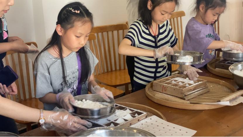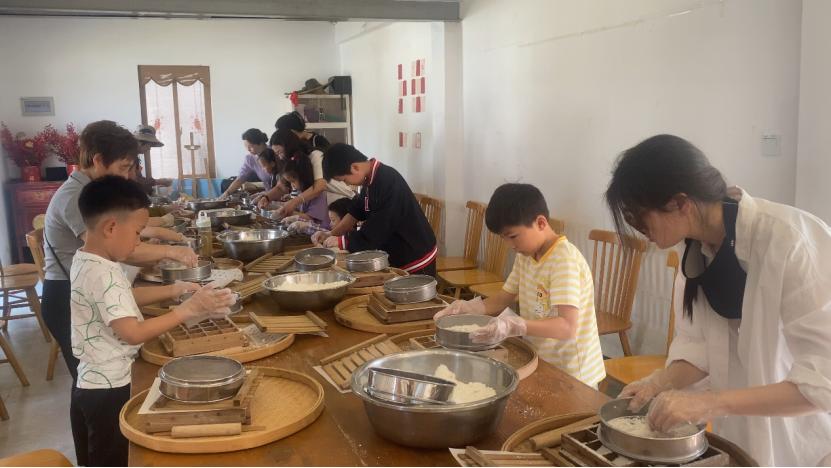 在现场,非物质文化遗产蛋糕的制作区充满了香味。奶奶向孩子们展示了传统的做蛋糕的过程。从筛粉到出模,每一步都蕴含着岁月积累的技巧。随后,亲子家庭开始感受米粉从手中形成到米香浓郁的蛋糕所产生的满满的成就感,对非物质文化遗产食品有了深刻的理解。