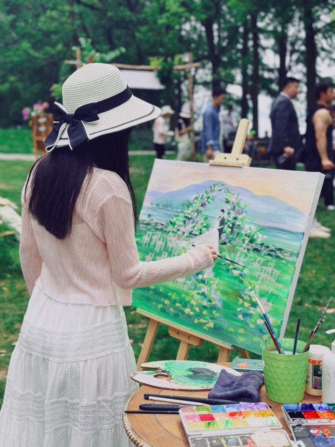 贺雪融说:“婚礼绘画是近两年才流行起来的。贺雪融本科毕业于湖北美术学院水彩专业。毕业后,她担任美术教师、壁画师和艺术培训机构的员工。2023年,她开始从事自由职业,兼职婚礼绘画家。