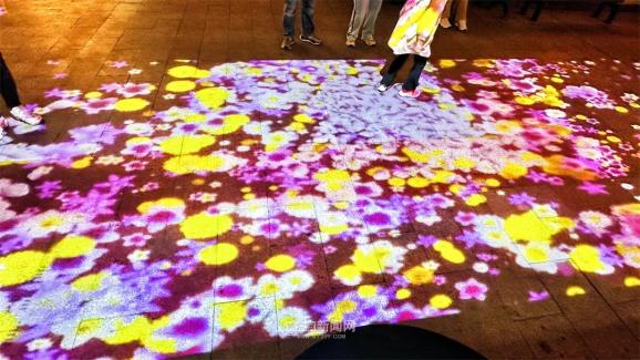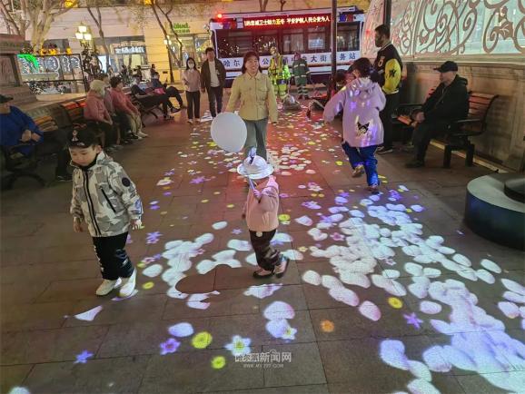 与游客互动展示四季风光,中央街道辅助街道互动投影灯点亮城市美好时光。