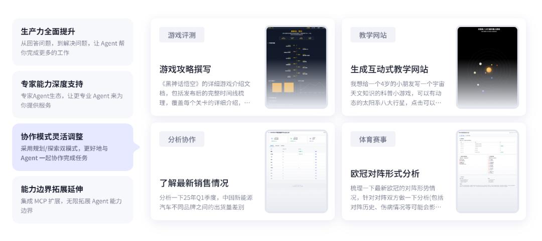 目前的共识是,Agent的能力取决于底层模型水平。但是使用自研模型OpenAI,并调用Claude 与3.7等模型Manus相比,纽扣的底层模型采用Doubao-1.5的深度思维模型,这是豆包最新发布的。-thinking-pro,从性能和部分开发者的反馈效果来看,按钮Agent的表现略逊于前者,无论是文本理解思维能力还是代码导出能力。