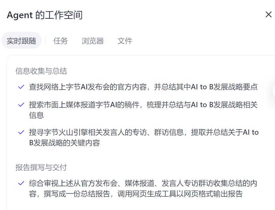获得感受码后,光锥智能使用“字节一年To” 为了帮助Agent收集信息并生成分析报告,B的AI战略要求。Agent将任务拆解成四个步骤,并在测试人员的建议下给出最终的拆解结果: