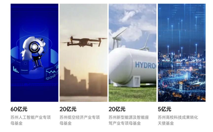 苏州人工智能产业重点母金基金,苏州总规模60亿元;低空经济产业重点母基金,总规模20亿元;苏州新能源与智能驾驶产业重点母基金,总规模20亿元;苏州高校科技创新转化天使基金,总额5亿元。