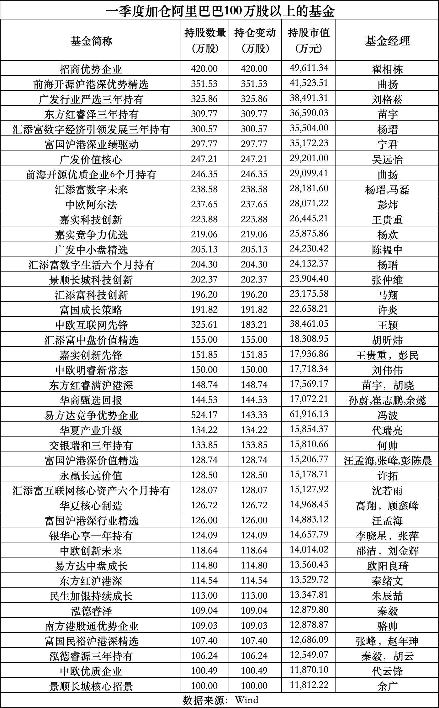 Wind数据显示,一季度有42只基金加仓超过100万股阿里巴巴。-W。在这些企业中,加持最多的是翟相栋管理的招商优势企业,加仓420万股。