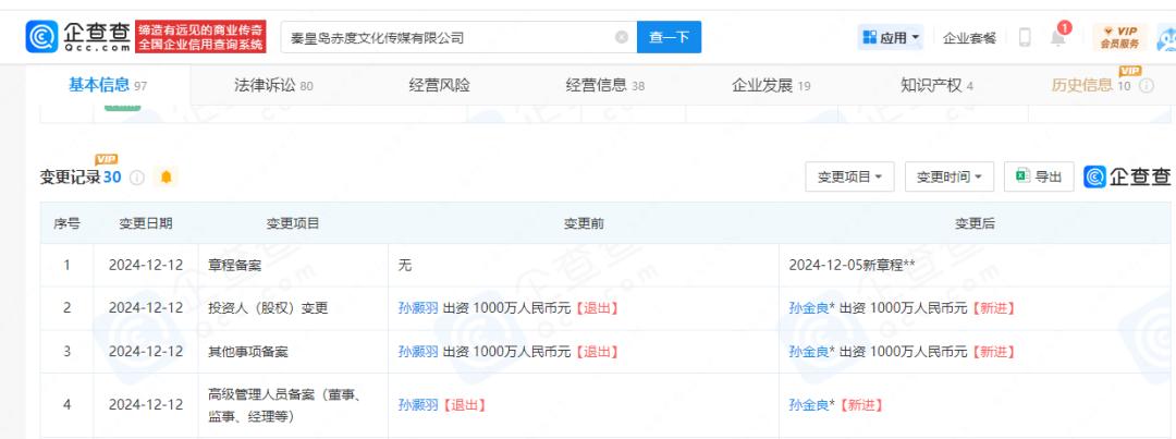 不仅如此,早在去年12月,孙昊羽就退出了秦皇岛赤度文化传媒有限公司的股东队伍,并辞去了法定代表人、总经理等职务。
