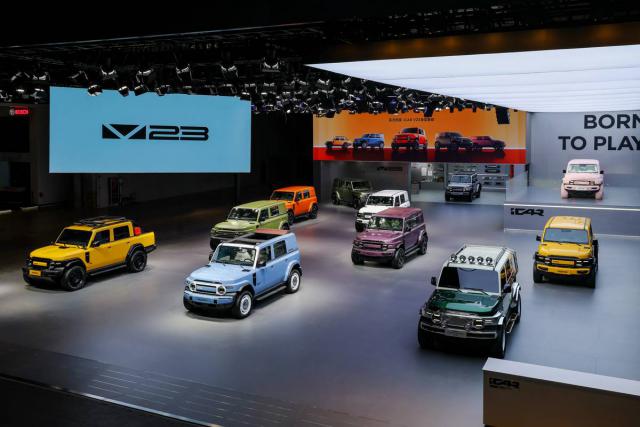 V23 基于皮卡概念车 V23 经典复古技术基因,面向国内玩新能源皮卡用户和普通海外客户,打造小型轻型越野皮卡新范式。车身长度延长到 4600mm 上述创意设计的后箱空间通过滑轨系统、挂架、外部扩展接口和超载 100kg 折叠尾门可以实现“移动工作站”和“户外生活舱”的双重属性,充分满足骑自行车、朋友、钓鱼等新的游戏场景需求,提前布局未来进入国外市场。