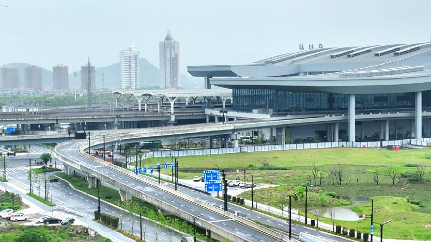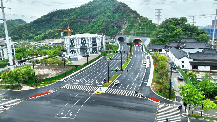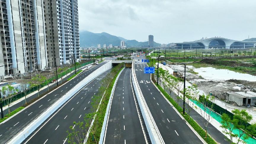 从空中俯瞰,东西方向的新路面贯穿乌龟山隧道,道路两旁郁郁葱葱的绿色植物层层叠叠。随着项目的繁重建设,台州站与主城区之间建立了“快进快出”的高效交通网络,不仅缩短了时间和空间的距离,也为城市发展注入了新的活力。