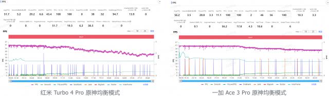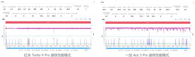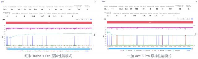 而且双方都打开了性能模式之后,情况就不同了。经过半个小时的检测,两部手机都可以顺利运行,红米 Turbo 4 Pro 平均帧率已经达到 59.9 帧,虽然红米 Turbo 4 Pro 帧率仍有一些起伏,没有一加。 Ace 3 Pro 如此稳定,但是平均帧数与一加相比。 Ace 3 Pro 的 59.5 帧,更高一点。