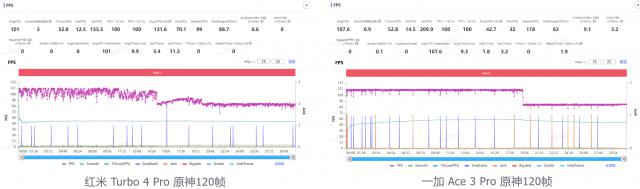 打开 120 帧法,红米 Turbo 4 Pro 半小时平均帧率 101 帧;一加 Ace 3 Pro 半小时平均帧率 107.6 帧。虽然平均帧率相差不大,但这种稳定性却是天上一地。