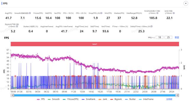 根据 PerfDog 测试,原神须弥城跑图,平衡模式,画质选择高,帧率手动调整至 60 帧,红米 Turbo 4 Pro 一开始帧率波动很大,半小时平均帧率只有 41.7 帧。