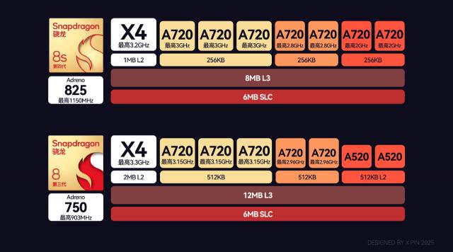 值得注意的是,这次 8s Gen 4 对比 8 Gen 3 缓存不像去年那样 8s Gen 3 对比 8 Gen 2 如此砍得太多,在游戏性能方面是可以期待的。