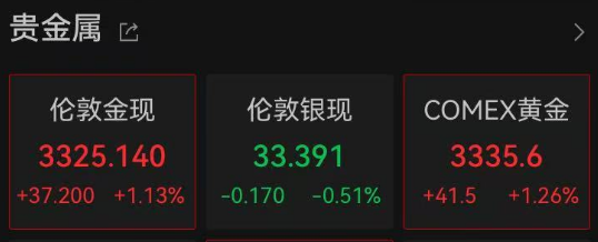 黄金价格上涨,现货黄金上涨1%以上,目前报3325.14美元/盎司。