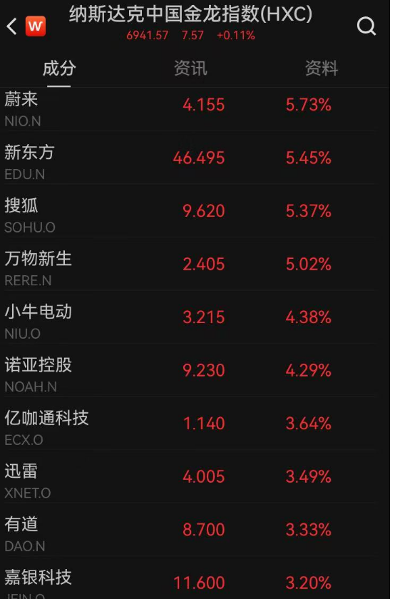 纳斯达克中国金龙指数从下跌到上涨。个股方面,蔚来、新东方、搜狐涨幅超过5%。、