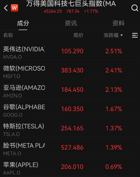 七大美国科技巨头集体上涨。英伟达,微软,亚马逊上涨了2%以上。