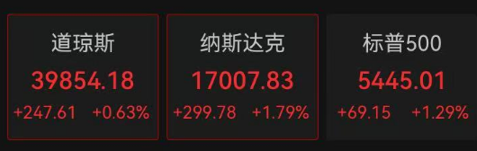 截至发稿时,纳指上涨1.79%,标普500指数上涨1%以上,道指上涨0.63%。