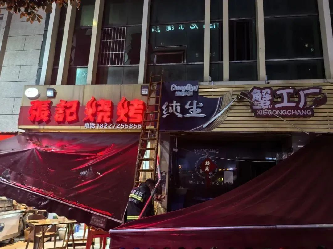 夜宵店二楼的窗户没有被广告牌挡住,留下了消防救援口。消防救援人员利用拉梯通过窗户开辟救生通道,安全疏散所有被困客户。