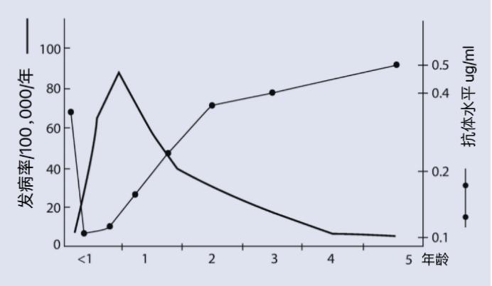 由于母传抗体水平下降,Hib 传染病的发生率来自 4 月龄开始迅速上升,但是在 1 98.3岁以后开始下降。%的 Hib 脑膜炎是发生的 2~12 一个月大的孩子,2 年龄儿童中的发生率为 1.7%。因此 Hib 接种疫苗的免疫程序与年龄有关。