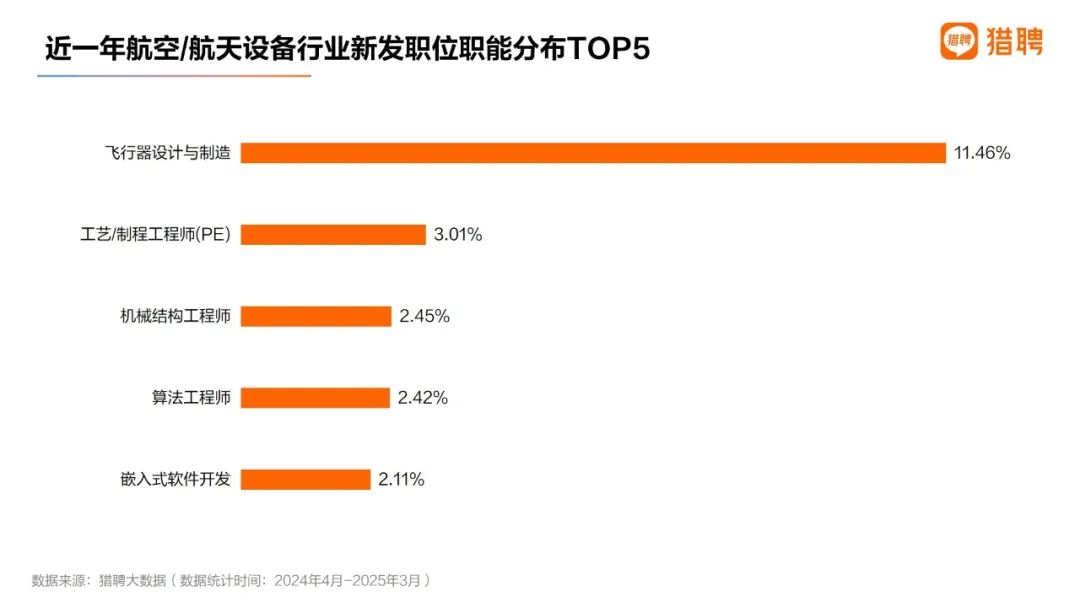 猎聘大数据显示,近一年来,“飞机设计制造”以11.46%的比例位居航空/航天设备行业新职位分布TOP5第一,远超其他职责。