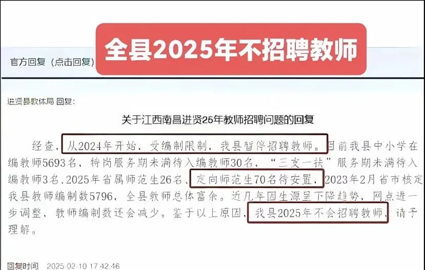此前,江西南昌进贤公开宣布,2025年不招聘教师。