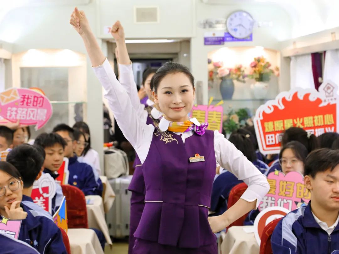 随后,合肥客运段青年空姐带来了充满活力的舞蹈《开始快乐》,车箱瞬间成为青春的舞台,学生们的掌声和欢呼声此起彼伏。
