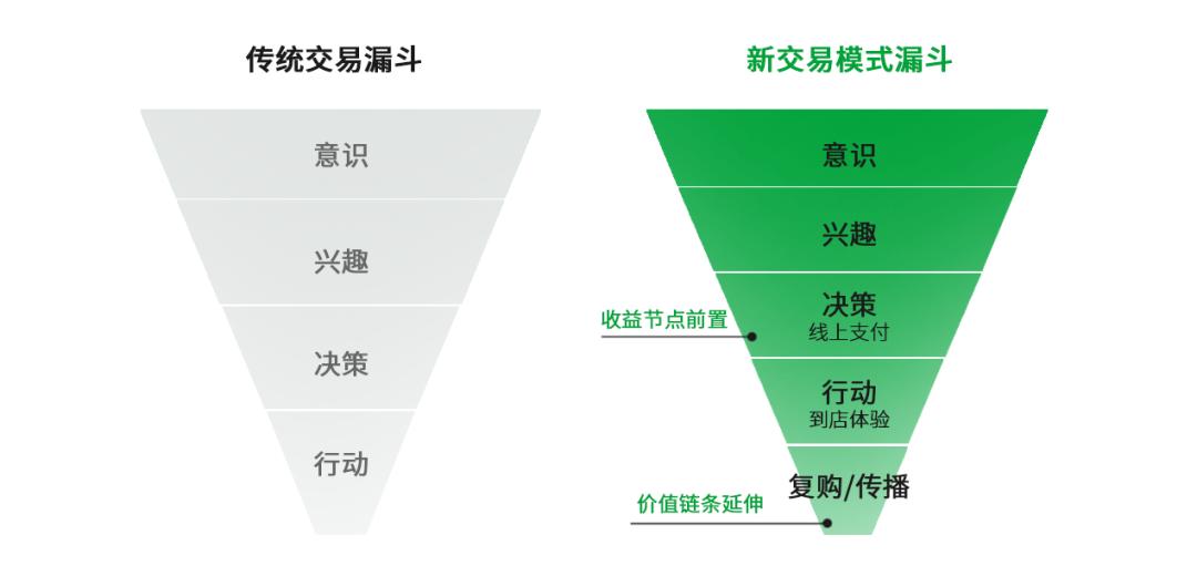 感受外置在进入实体店之前,让消费者提前建立起对产品的认知和期望;需求激起然后借助精确的营销手段和创新的内容呈现,探索消费者的隐性需求,将原本模糊的购买意向转化为强烈的消费欲望。基于此,“交易先行”顺势而生——利用卡券、权益等手段,快速引导用户完成线上交易,锁定收益,缩短最后200米从线上到线下转换完成交易。这种模式大大缩短了商家与客户之间的交易距离,彻底打破了传统“等客上门”模式中时间和空间的限制。