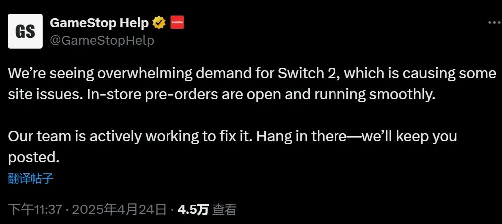 并且GameStop在当地时间11点开始预订,站点在第一时间就完全崩溃了。公司隔半小时宣布网站崩溃,婉转地建议消费者可以到线下商店排队。