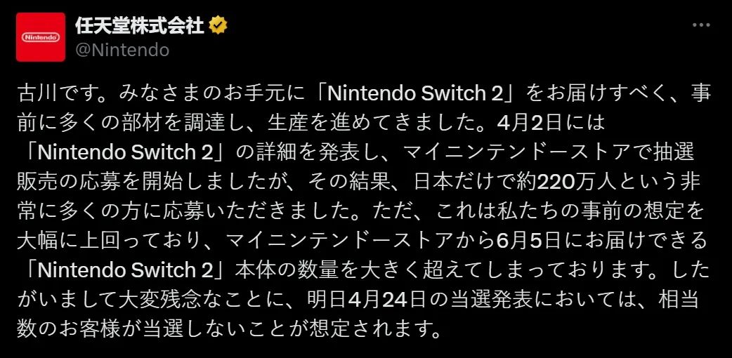 但是,在结果公布之前,任天堂总裁古川俊太郎曾扬言要“备货”,避免黄牛倒卖,已公开道歉。。