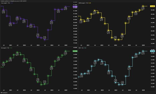 假如你看看Meta的毛利率,营业利润,EBITDA 或者净利率,你会发现它们都很强,而且在 2022 年度放缓后,在过去的几年里又有所增长: