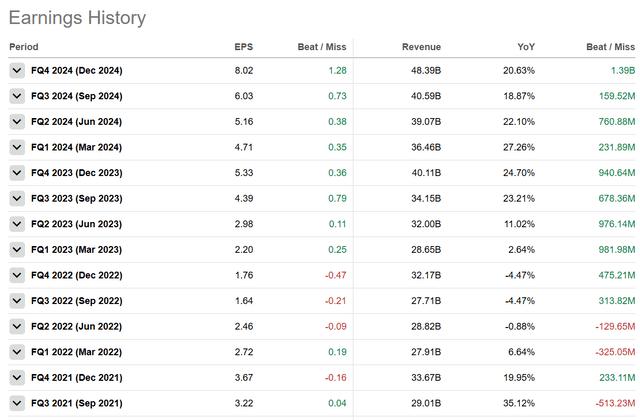最近Meta表现强劲。近期业绩表明,销售额同比增长势头强劲,而且每股收益一直保持着良好的增长势头。