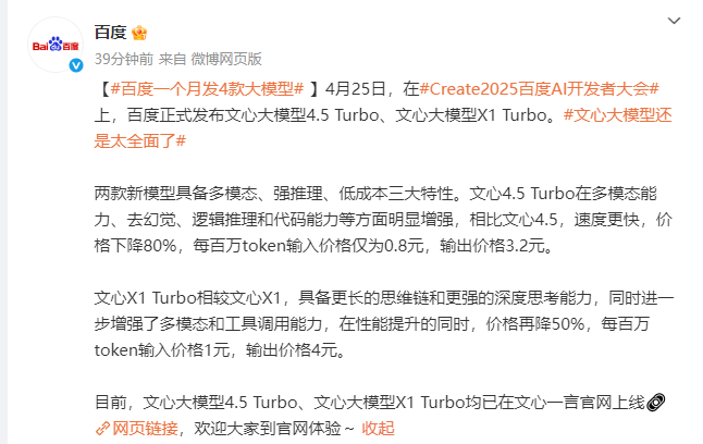 根据百度官方微博消息,4月25日,在Create2025百度AI开发者大会上,百度正式发布文心大模型4.5 Turbo、文心大模型X1 Turbo。