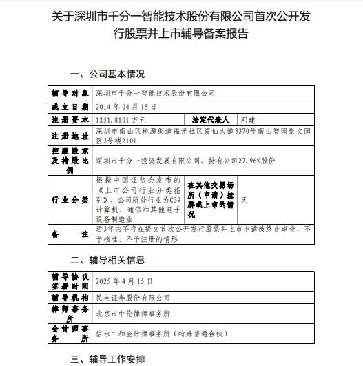 四月二十四日,根据证监会官网,深圳千分一智能技术有限公司(以下简称“Maxeye)开放上市辅导,计划首次在a股市场公开发行股票并上市,辅导机构为民生证券有限公司。