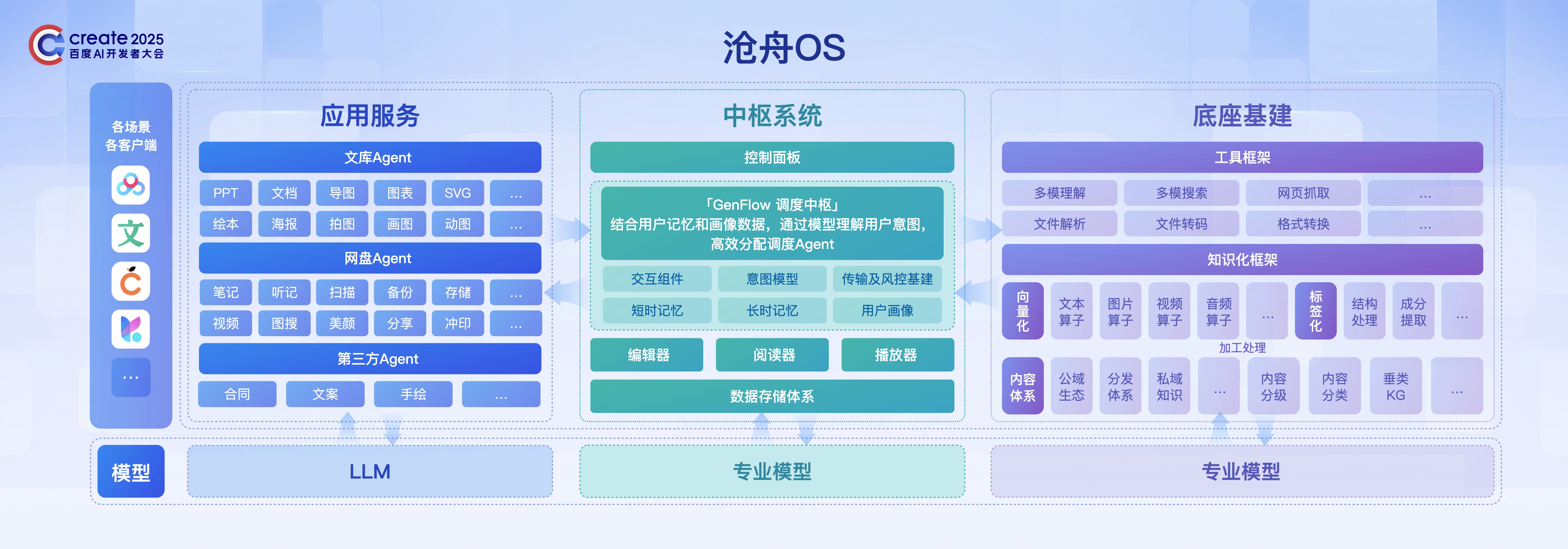 在此基础上,4月25日,百度创始人、董事长兼首席执行官李彦宏在Create2025百度AI开发者大会上宣布,百度文库与百度网盘联合推出“沧舟OS”,这也是世界上第一个内容领域的操作系统,将AI的能力沉淀到了系统级的技术基础上,真正实现了从深入思考到深度交付的基础。