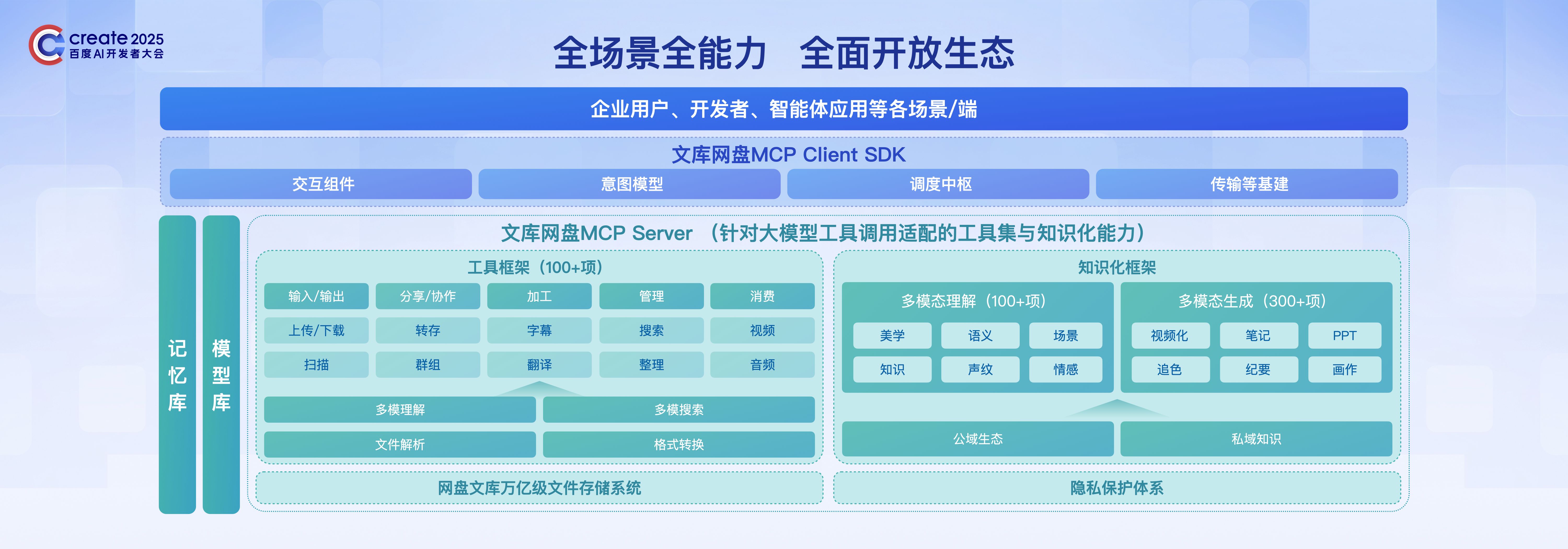 所以,为了最大限度地发挥生态和应用价值,在“沧舟OS”的基础上,百度文库、百度网盘率先充分利用MCP进行产品和生态链接,构建MCP Server-Client-通过MCPP,Host三层系统可以使用文库、网盘的能力。 为了更多的企业和开发者,Server方式是开放的。