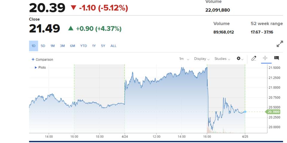 美国当地时间周四,英特尔股价上涨0.9美元,收于每股21.49美元,上涨4.37%。截至本文发布时,该股在盘后交易中下跌了5%以上,目前的交易价格为每股20.39美元。