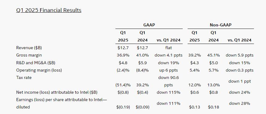 4月25日,当地时间周四美股收盘后,芯片巨头英特尔发布了2025年第一季度财务报告。财务报告显示,英特尔第一季度营收为127亿美元,与去年同期持平;属于英特尔的净亏损为8亿美元,而去年同期为4亿美元;稀释后,每股亏损0.19美元,而去年同期每股亏损0.09美元。